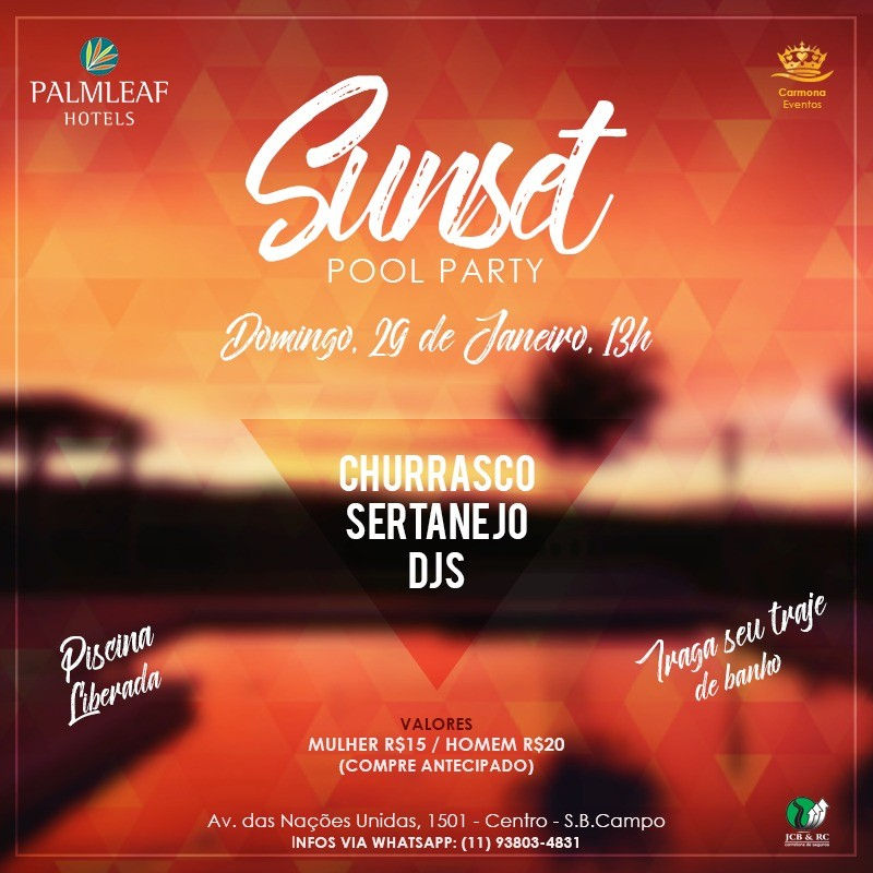 Pessoal, aguarde mais um pouco porque domingo, 29 de Janeiro as 13h, a Agência Carmona Eventos & Promoções com parceria com o Hotel Palmleaf realizarão o evento “Sunset Pool” Party 1° edição, com o objetivo de promover a mais nova balada do ABC, na estação mais quente do Brasil. Caso queira mais uma opção para curtir seu verão 2017 com mais animação, a festa será das 13h às 22h.